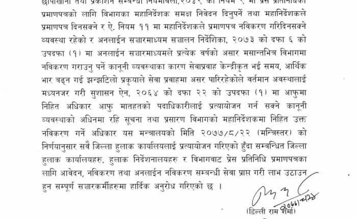 अव सवै जिल्ला हुलाक कार्यालय र हुलाक निर्देशनालयहरुबाट प्रेस प्रतिनिधि प्रमाण पत्रका लागि आवेदन, नविकरण तथा अनलाइन नविकरण सेवा प्रवाह हुनेछन् ।