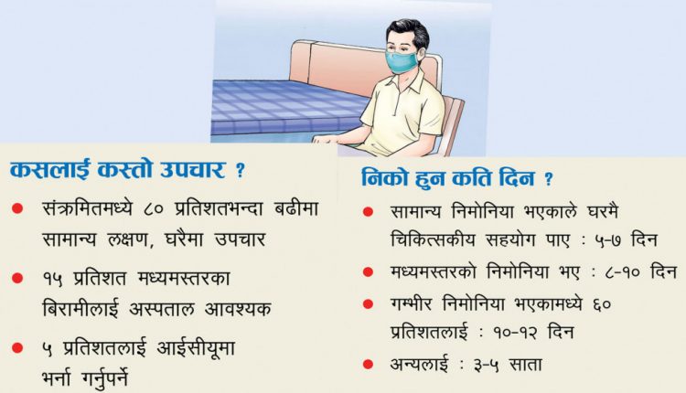 डा. दासले कोरोना संक्रमणले सामान्य निमोनिया भएकाहरू घरमै चिकित्सकीय सहयोग एवं सल्लाहमा उपचाररत रहेको र ५–७ दिनमा निको भइरहेको बताए । उनका अनुसार मध्यमस्तरको निमोनिया भएकाहरूलाई निको हुन ८ देखि १० दिन लाग्ने गरेको छ । गम्भीर निमोनिया भएकामध्ये करिब ६० प्रतिशतलाई निको हुन १० देखि १२ दिन र बाँकी ४० प्रतिशतलाई ३ देखि ५ सातासम्म लाग्न सक्छ । ‘भेन्टिलेटर नचाहिने गम्भीर निमोनिया भएकामध्ये ७० देखि ८० प्रतिशतसम्म र भेन्टिलेटरमा रहेका १५ देखि २० प्रतिशतसम्म बिरामी निको भइरहेका छन्,’ डा. दासले भने ।