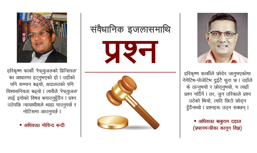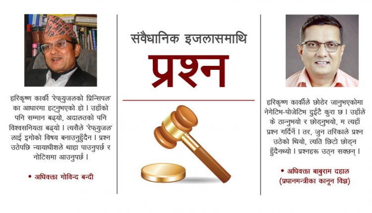 यसअघि हरिकृष्ण कार्कीबाहेक हुनुपर्छ भनेर हामीले आग्रह गरेका थियौं । उहाँले बेन्च छाडनुभो । उहाँको पनि सम्मान बढ्यो, अदालतको विश्वसनियता पनि बढ्यो । अहिले माननीय हरिकृष्ण कार्कीको ठूलो प्रतिष्ठा छ । त्यसैले ‘रेफ्युजल’ लाई इगोको विषय बनाउनु हुँदैन ।