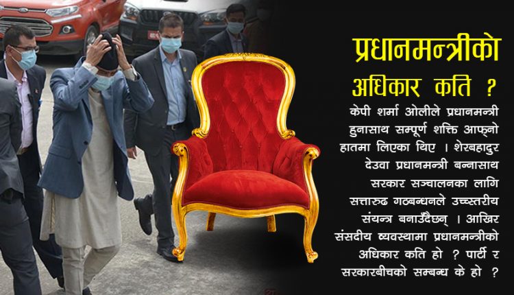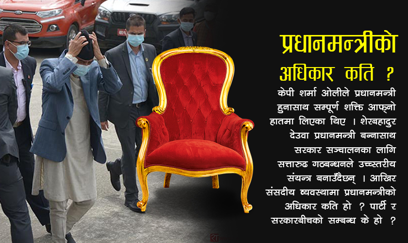 अहिले ओलीको ठाउँमा शेरबहादुर देउवा प्रधानमन्त्री बन्न आइपुगेका छन् । सरकार फेरिएको छ, तर बहस फेरिएको छैन । हामीले अपनाउँदै आएको यो व्यवस्थामा प्रधानमन्त्रीको पावर कति हो ? प्रधानमन्त्रीमाथि पार्टीले के–कति नियन्त्रण गर्न मिल्छ ? प्रधानमन्त्री आफ्नो पार्टी वा गठबन्धनप्रति उत्तरदायी हुनुपर्छ कि स्वायत्त हुनुपर्छ ? यी प्रश्नहरू देउवामाथि पनि तेर्सिन थालिसकेका छन् ।
