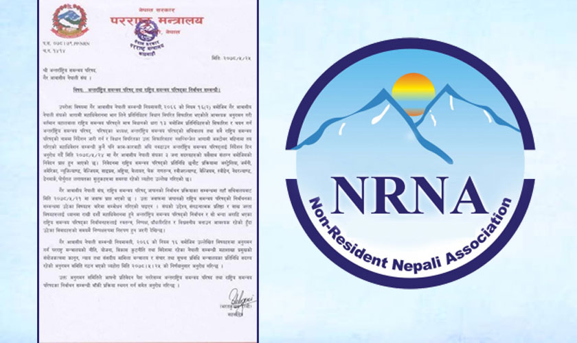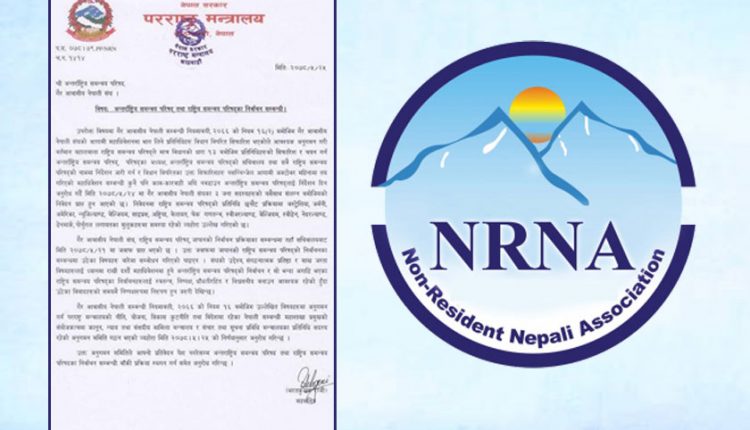 एनआरएनको चुनावमाथि हस्तक्षेप गर्दै परराष्ट्र मन्त्रालयले आगामी अक्टोबर २० (कात्तिक ३ गते) मा हुने निर्वाचनसम्बन्धी कुनै पनि प्रक्रिया अघि नबढाउन भनेको छ । परराष्ट्र मन्त्रालयका सहसचिव भरतकुमार रेग्मीले भदौ २५ गते एनआरएनएलाई पत्र लेखेर निर्वाचन रोक्न निर्देशन दिएका हुन् ।