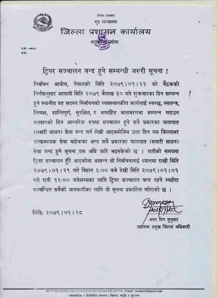 जिल्ला प्रशासन कार्यालय काभ्रेपलाञ्चोकले सूचना प्रकाशित गरी मिति २०७९ वैशाख २९ गते बिहान ६ बजेदेखि २०७९ जेठ १ गते राति १२ बजेसम्म ट्रिपर सञ्चालन बन्द रहने जनाएको हो । अन्यको हकमा भने निर्वाचनका दिन बैशाख ३० गते अति आवश्यक सवारी साधन बाहेक अरु सावरी साधन बन्द गरिएको जिल्ला प्रशासन कार्यालय काभ्रेले जनाएको छ ।