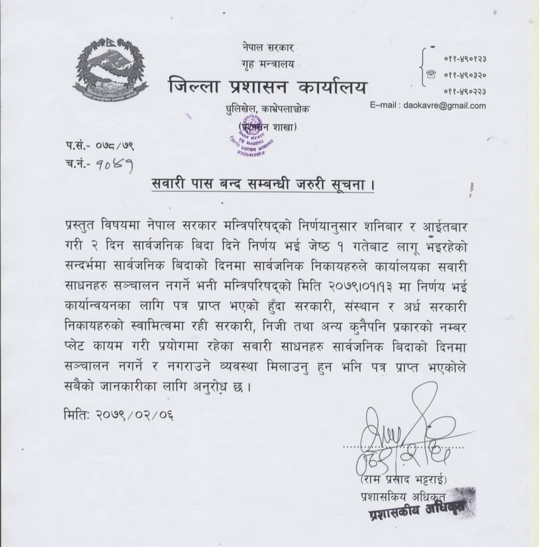 हप्ताको २ दिन बिदा दिने निर्णय मन्त्रिपरिषदको मिति २०७९ बैशाख १३ गते निर्णय भई कार्यान्वनका लागि पत्र प्राप्त भएको भन्दै जिल्ला प्रशासन कार्यालय धुलिखेल काभ्रेले सुचना जारी गरेको छ । जिल्ला प्रशासन कार्यालय धुलिखेलका प्रशासकीय अधिकृत राम प्रसाद भट्टराईले हस्ताक्षर गरेको सुचनामा भनिएको छ ।