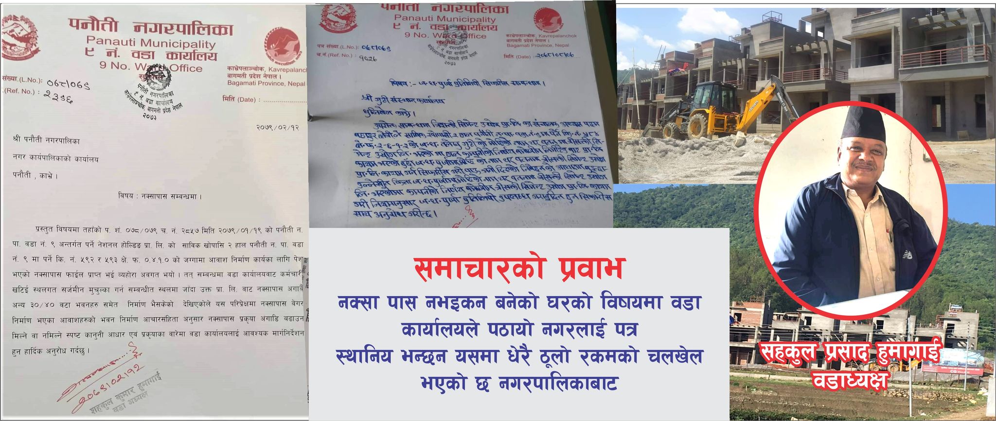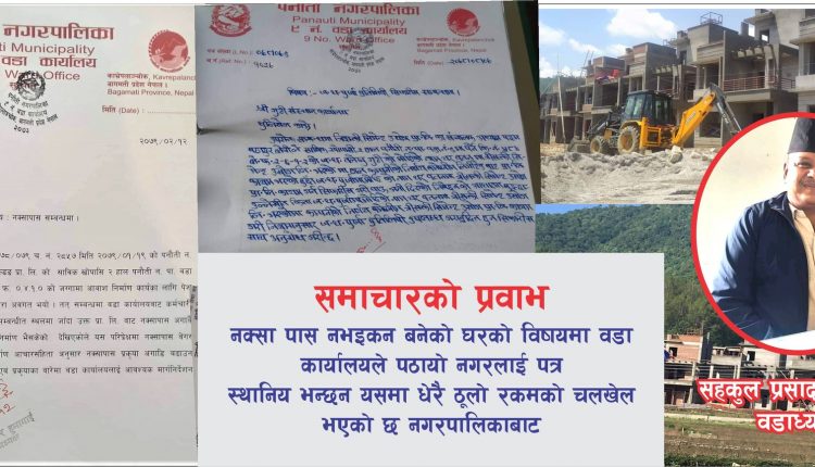 पनौती भिलेजमा नक्शा पास नभएका घरहरु निर्माण भैरहेको बारे मिडिया दर्पणमा समाचार आएपछि पनौती नपा वडा नम्बर ९ ले यस बारेमा चासो दिएको हो । काभ्रेको पनौती नगरपालिका– ९ स्थित खोपासीमा सिजि प्रोपर्टीज प्रा.लि. ललितपुरले नक्सा पास नै नगरि सामुहिक आवास निर्माणको काम गरिरहेको भन्ने समाचार केही दिन अगाडि मिडिया दर्पण आएपछि वडा कार्यालयले यस विषयमा चासो दिएको छ ।
