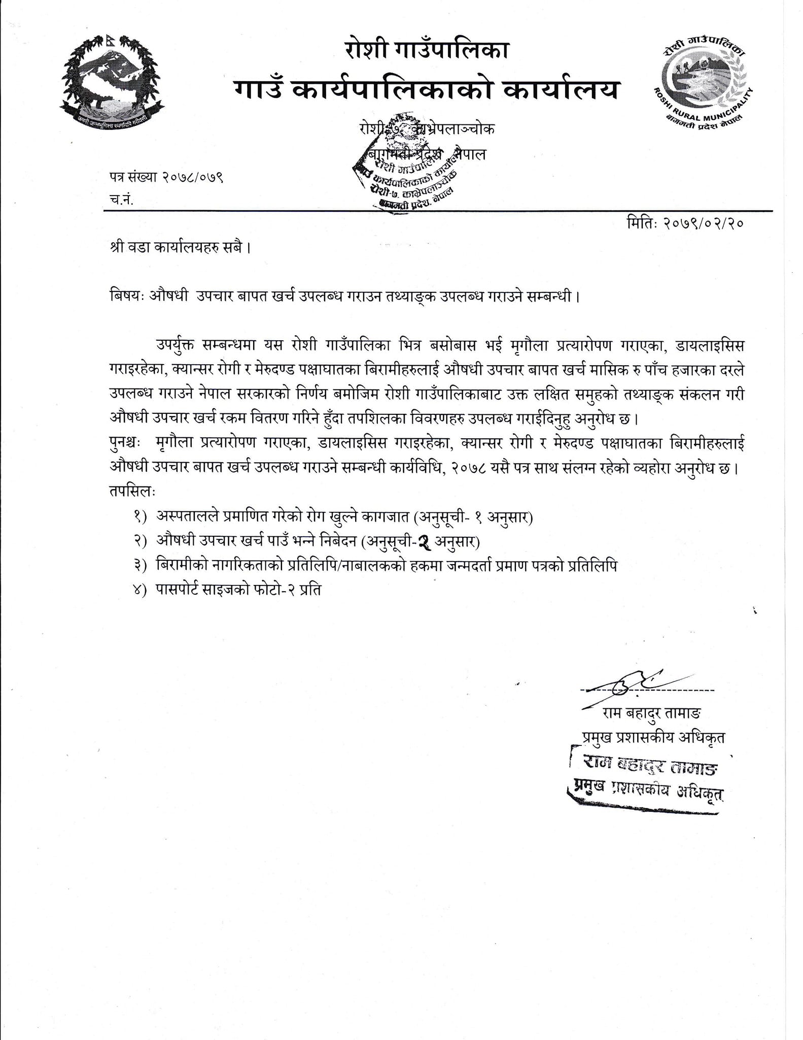 औषधि उपचार खर्च प्राप्त गर्नका लागि अस्पतालले प्रमाणित गरेको रोग खुल्ने कागजात (अनुसूचि १ अनुसार) , औषधि उपचार खर्च पाउँ भन्ने निबेदन (अनुसूचि २ अनुसार) , गम्भिर प्रकृतिका रोगबाट ग्रसित बिरामीको नागरिकताको प्रतिलिपि (नाबालकको हकमा जन्मदर्ताको प्रमाणपत्रको प्रतिलिपि) र पासपोर्ट साईजको फोटो २ प्रति सहित गाउँपालिका कार्यालयमा सम्र्पक गर्न गाउँपालिका अध्यक्ष दिनेश लामाले आग्रह गरेका छन् ।