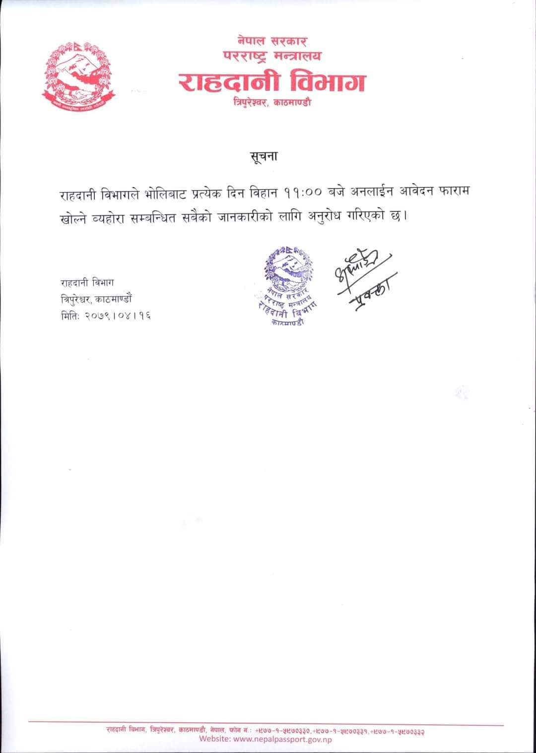 काठमाडौं /राहादानी विभागले ई–पासपोर्टको अनलाइन आवेदन मंगलबारबाट बिहान ११ बजेदेखिनै खुल्ने भएको छ । राहदानी विभागले यसअघि साँझ साढे ४ बजेपछि खुलाउँदै आएकोमा मंगलबारदेखि बिहान ११ बजेबाट नै खुलाउन लागेको हो ।