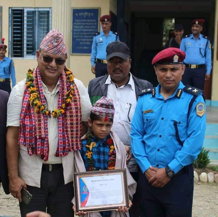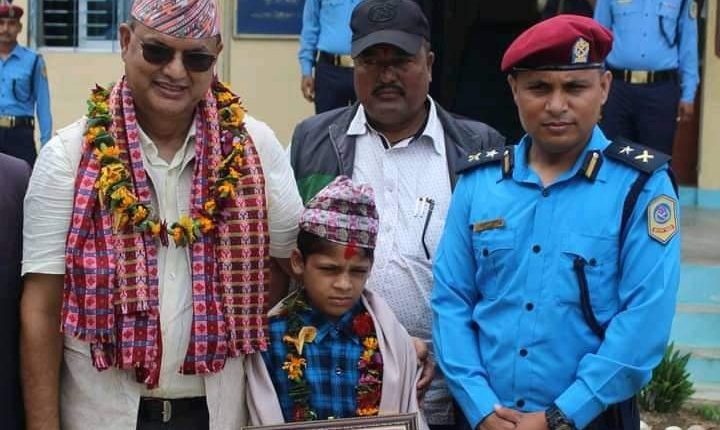 शुक्रबार जिल्ला प्रहरी कार्यालय अछामले एक कार्यक्रमकाबीच पञ्चदेवल विनायक नगरपालिका–६ बान्नी की ५३ वर्षीया जैसरा न्यौपानेमाथि अभद्र व्यवहार गर्दै कुटपिट गरेको भिडिओ खिच्ने जैसराका ११ वर्षीय नाती दीपेन्द्र न्यौपानेलाई सम्मान गरेको हो ।