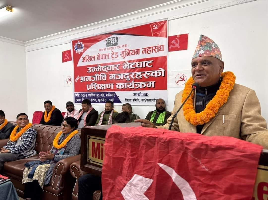 धुलिखेल/ नेकपा माओवादी निकट मजदुर संगठन अखिल नेपाल ट्रेड युनियन महासघ काभ्रेको आयोजनामा आगमी मङ्सिर ४ गते हुने निर्वाचनको लागि बाम लोकतान्त्रिक उम्मेदवार हरु सङ भेटघाट तथा मजदुर हरुलाइ प्रशिक्षण कार्यक्रम गरिएको छ ।
