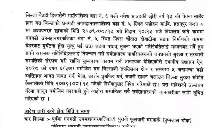 जिल्ला बैतडी डिलासैनी गाउँपालिका वडा नं. ६ बस्ने गणेश साउदकी छोरी वर्ष १५ की चेतना साउँद हाल यस जिल्लाको धनगढी उपमहानगरपालिका वडा नं. ५ स्थित पञ्चोदय मा.वि. हसनपुर कक्षा ८ मा अध्ययनरत छात्राको मिति २०७२/०८/१५ गते विहान १०:१५ बजे विद्यालय जाने क्रममा धनगढी उपमहानगरपालिका वडा नं. ५ स्थित पिपल चौतारा दोबाटोमा सडक निर्माणको क्रममा ग्रेडरबाट दुर्घटना हुँदा मृत्यु भई उक्त घटना पश्चात् सृजना भएको परिस्थितिलाई मध्यनजर गर्दै हुन सक्ने अराजक गतिविधिहरुलाई नियन्त्रण गरी सर्वसाधारण नागरिकहरुको जनधनको सुरक्षा र सरकारी सम्पत्तिको संरक्षण गरी शान्ति सुव्यवस्था कायम गर्न आवश्यक देखिएकोले स्थानीय प्रशासन ऐन, २०२८ को दफा ६ (३क) बमोजिम यस जिल्लाको पूर्वमा धनगढी उपमहानगरपालिका- १ पुरानो फूलवारी बसपार्क ( पुष्पलाल चोक),पश्चिममा धनगढी उपमहानगरपालिका-४ रातोपुल, उत्तरमा धनगढी उपमहानगरपालिका-५ सामुदायिक प्रहरी सेवा केन्द्रको भवन, दक्षिणमा धनगढी उपमहानगरपालिका १ र २ स्थित हुलाकी राजमार्ग क्षेत्रमा पाँच जनाभन्दा वढी व्यक्तिहरु आवत जावत गर्न, भेला, प्रदर्शन, घुमफिर गर्न, सवारी साधन चलाउन जिल्ला सुरक्षा समिति कैलालीको मिति २०७९।०८।१५ गतेको निर्णयानुसार निषेध गरिएको छ कैलालीका प्रमुख जिल्ला अधिकारी किरण थापाद्वारा जारी आदेशमा भनिएको छ ।