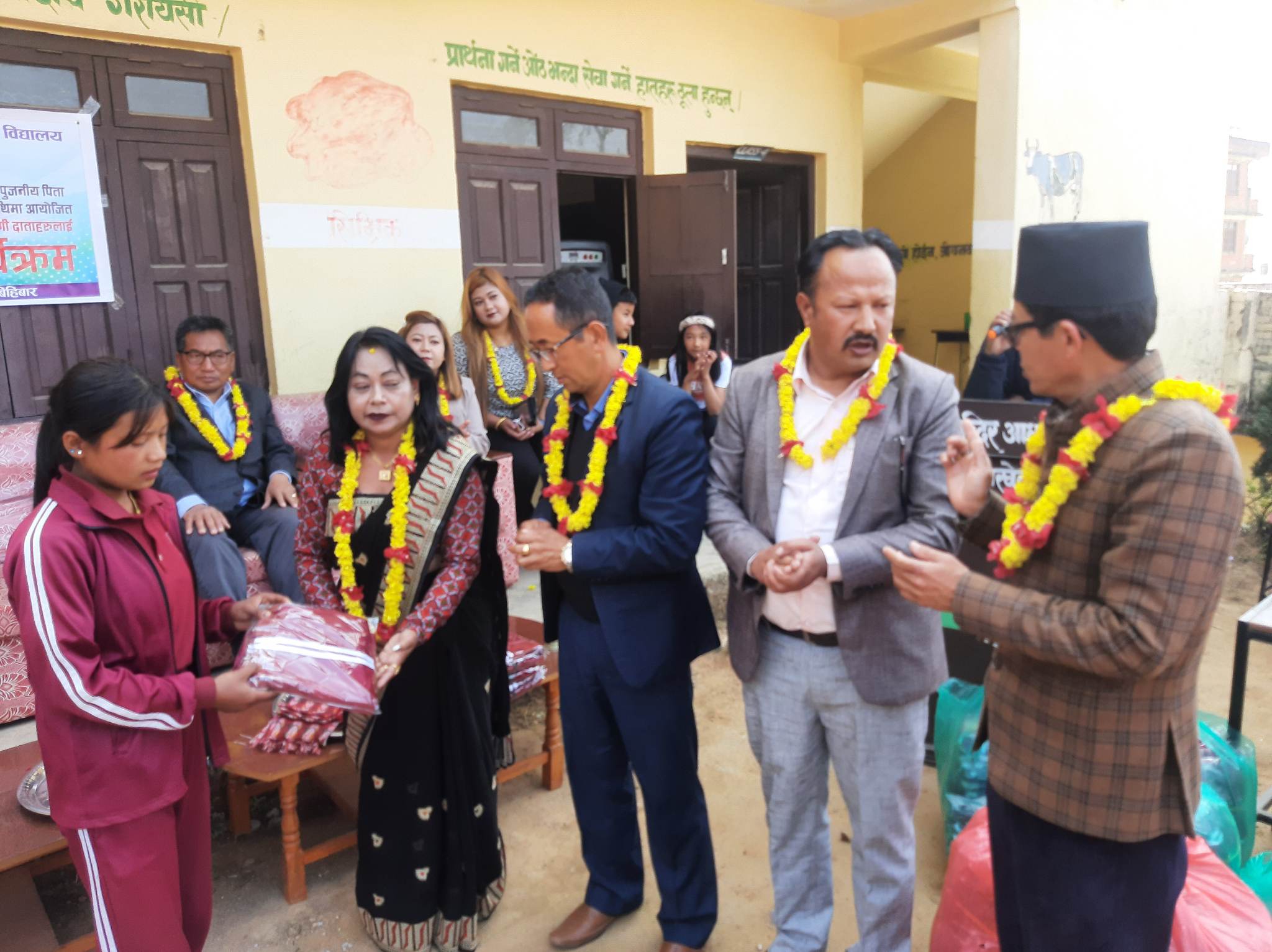 कार्यक्रममा समाजसेवी एवं यूवा नेता सवर प्रजापतिले आफूहरुले स्वा. बाजे ससुराको पून्य तिथिमा विगत ५ वर्ष देखि विभिन्न सामुदायिक विद्यालयका विद्यार्थीहरुलाई सहयोग गर्दै आएका बताए । यस कार्यका लागि आफूहरु सधैव लागि पर्ने समेत उनले बताए । कार्यक्रममा प्रमुख अथिति धुलिखेल नगरपालिकाका प्रमुख प्रशासकीय अधिकृत सुरेन्द्र थापामगरले पित्रीको सम्झानामा यसरी सामुदायि विद्यालयमा सहयोग गरि विद्यार्थीको मनबल बढाएको भन्दै धन्यावाद दिएका थिए ।