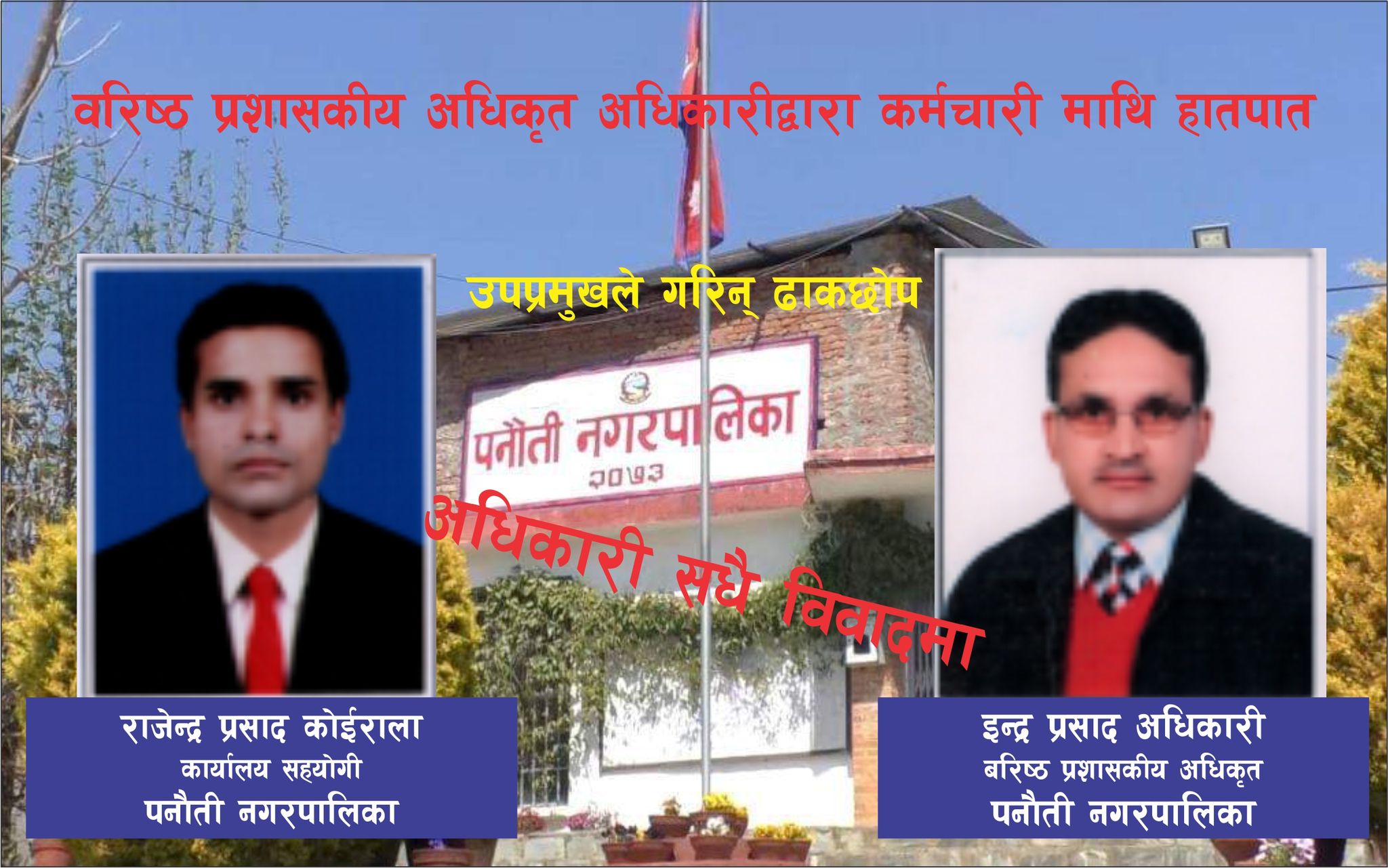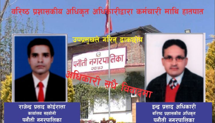 पनौती/  पनौती नगरपालिकाका बरिष्ठ प्रशासकीय अधिकृृत इन्द्रप्रसाद अधिकारीले नगरपालिकै कर्मचारीलाई उपप्रमुखकै कार्यकक्षमा हातपात गरेका छन् । अधिकारीले कार्यालय सहयोगी राजेन्द्रप्रसाद कोइरालालाई उपप्रमुख गिता वञ्जाराकै अगाडी ‘कठालो समातेका’ हुन् ।