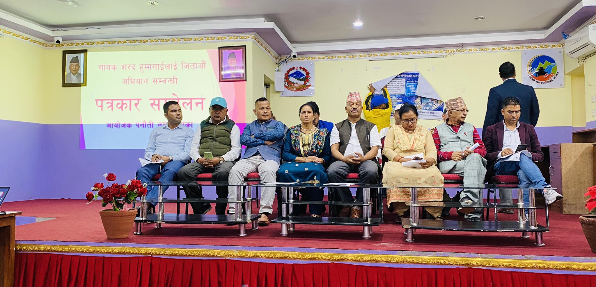 इन्ट्रा–नेशनल वेलफेर एण्डसपोर्ट फाउण्डेशन अफ अमेरिकाद्वारा आयोजित मेरो भ्वाइस यूनिभर्सको उपाधी प्राप्तिका लागि उनले गरेको मिहिनेतलाई पनौती र काभ्रेका सम्पूर्ण आमा बुबा दाजु भाइ दिदी बहिनीहरुले माया र हौसला दिन शरद हुमागाईंलाई भोटमार्फत जिताउन इन्ट्रा एप्स डाउनलोड गरी भोटिङ गरिदिन नगरपालिकाले आब्वान गरेको छ । पनौती नगर प्रमुख भण्डारीकाे सभापतित्वमा सम्मपन्न भएकाे पत्रकर सम्मेलनमा वडा अध्यक्ष , वडा सदस्य एव कार्यपालिका सदस्य र पनाैति नगरपालिका भित्रका शरद हुमागाई जिताउ लागिपरेका उनका सुभचिन्तकहरुकाे उपस्थिति रहेकाे थियाे । सम्मेलन नगर प्रमुख भण्डारीको सचिवालय प्रमुख राजेशराज महतले कार्यक्रम सञ्चालन गरेका थिए ।