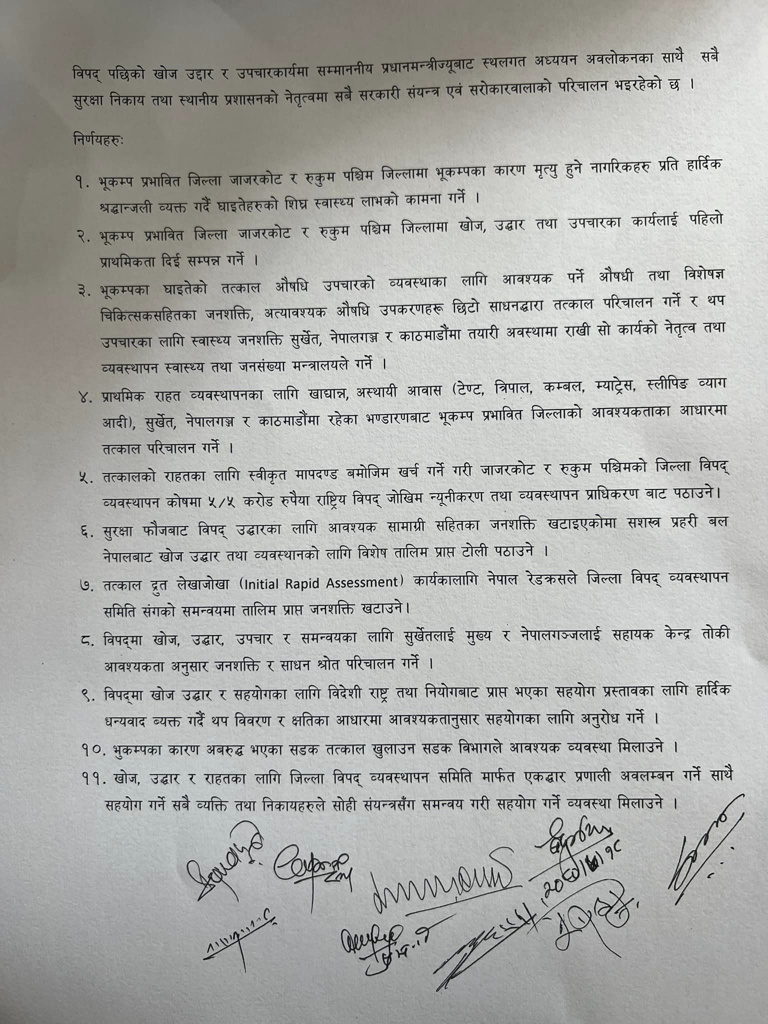 सरकारले भूकम्प प्रभावित जिल्ला जाजरकोट र रुकुम पश्चिममा खोज, उद्धार तथा उपचार कार्यलाई पहिलो प्राथमिकता दिई सम्पन्न गर्ने निर्णय गरेको छ । यस्तै तत्काल द्रत लेखाजोखा कार्यका लागि नेपाल रेडक्रसले जिल्ला विपद् व्यवस्थापन समितिसँगको समन्वयमा तालिम प्राप्त जनशक्ति खटाउने निर्णय गरेको छ ।