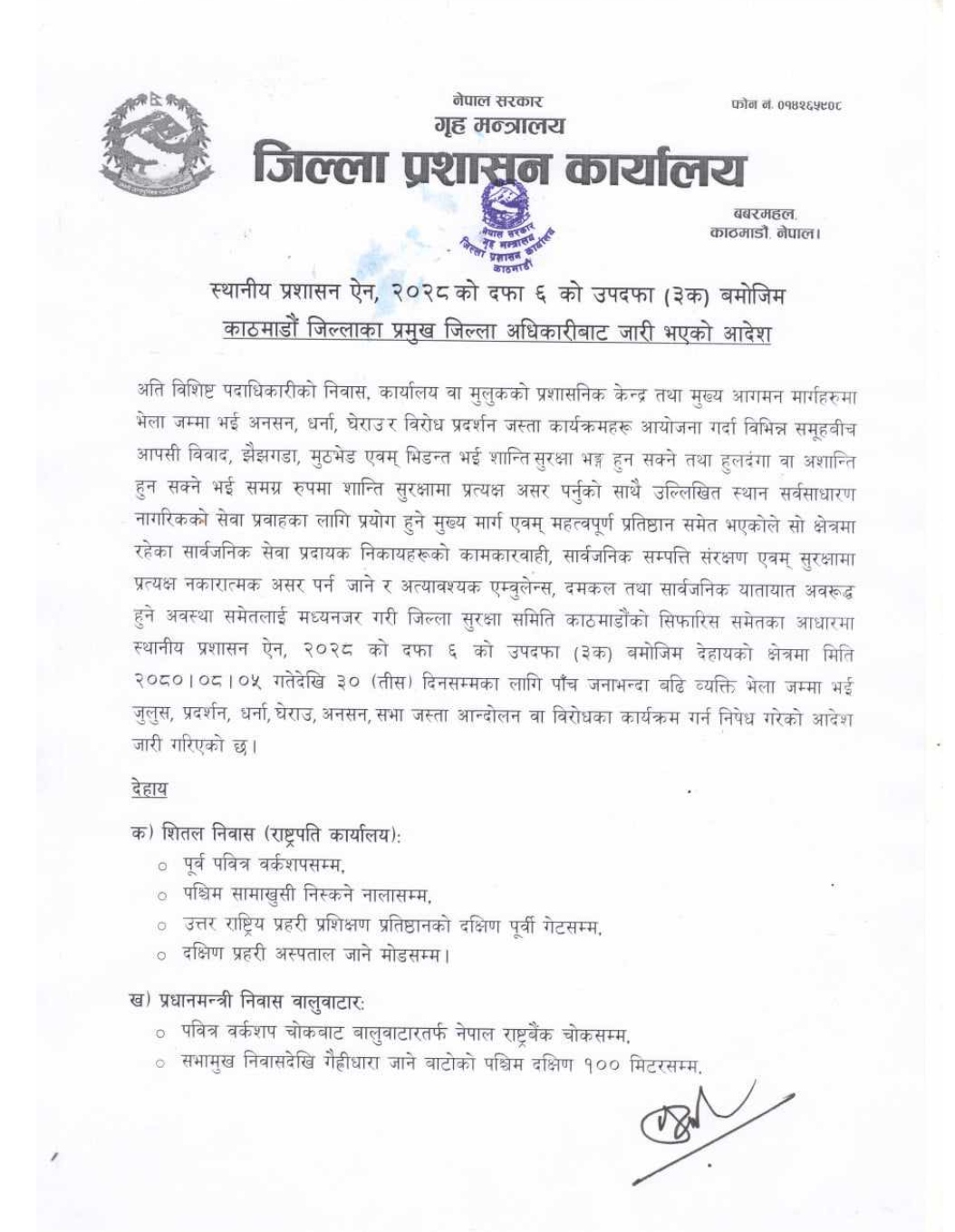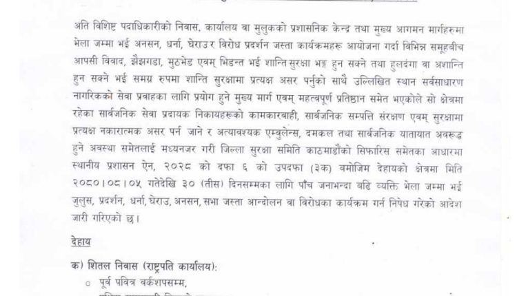 यस्तै बालुवाटारमा पवित्र वर्कशप चोकबाट बालुवाटारतर्फ नेपाल राष्ट्र बैंक चोक र सभामुखदेखि गैह्रीधारा जाने बाटोको पश्चिम दक्षिण १०० मिटरसम्म पाँच जनाभन्दा बढी भेला हुने नदिने आदेश जारी भएको हो ।