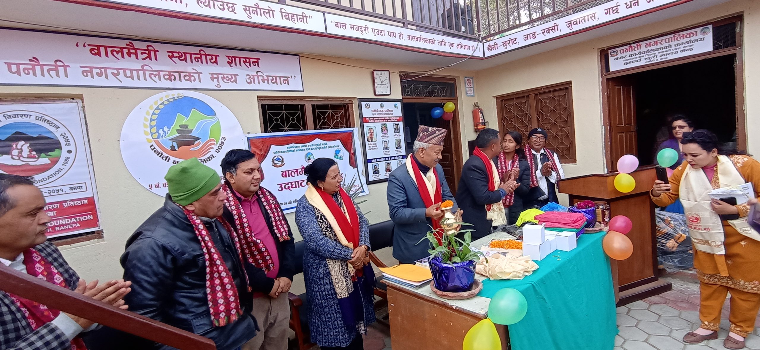पनौती । काभ्रे जिल्लाको पनौती नगरपालिका वडा नम्बर ५ ले आफ्नो वडामा बालमैत्री शाखा स्थापना गरेको छ । शनिबार एक कार्यक्रमका बीच नगरप्रमुख राम शरण भण्डारी र उपप्रमुख गीता बन्जाराले संयुक्त रुपमा शाखाको उदघाटन गरेका थिए। स्थापना भएको बालमैत्री शाखा भित्र बालबालिकाहरुको सर्वपक्षको हितको लागि सो कार्यकक्ष प्रयोग हुने जसमा बालबालिकाको नियमित योजनाको लागि भेला, पुस्तक तथा लाइब्रेरी तथा बालबालिकाको क्षमता अभिबिद्री गर्न साखा स्थापना गरिएको वडाका वडा अध्यक्ष विनोद खत्रीले जानकारी दिए । कार्यक्रमममा स्वागत मन्तव्य वडा सदस्य प्रेम बहादुर कुँवरले राखेका थिए । उनले बालबालिकाको क्षमता विकास, सिकाइमा स्थानीय स्रोत साधनको प्रयोगमा जोड दिन पनि आग्रह गरेका छन् ।