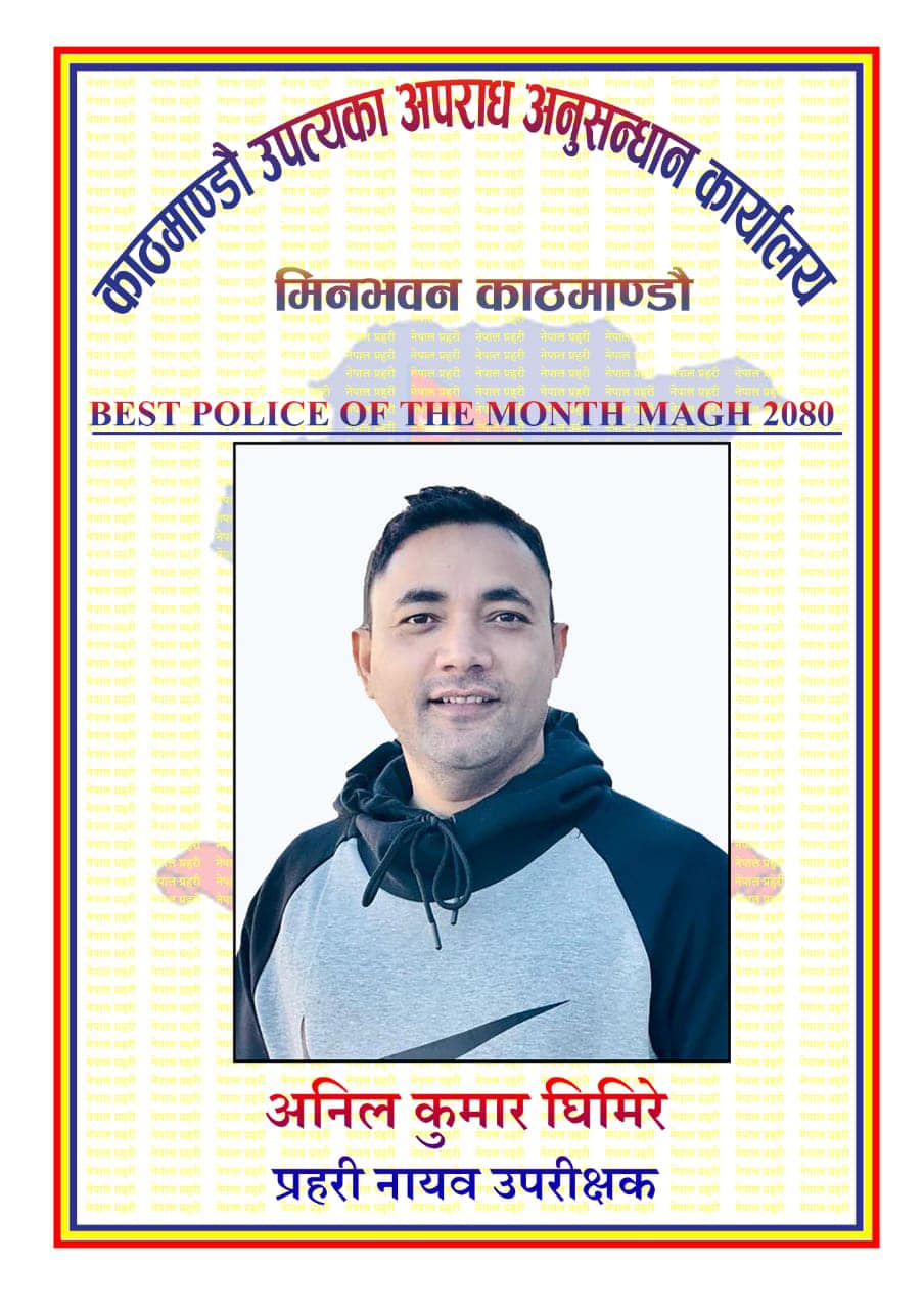 काठमाडौं । नेपाल प्रहरीका डिएस्पी अनिल घिमिरिे माघ महिनाको ‘पुलिस अफ दी मन्थ’ घोषित भएका छन् । काठमाडौं उपत्यका अपराध अनुसन्धान कार्यालयमा कार्यरत डिएस्पी घिमिरे उपत्यका अपराध अनुसन्धान कार्यालयले कार्यरत कर्मचारीमध्ये माघ महिनाको सर्वोत्कृष्ट घोषणा गरेको थियो ।