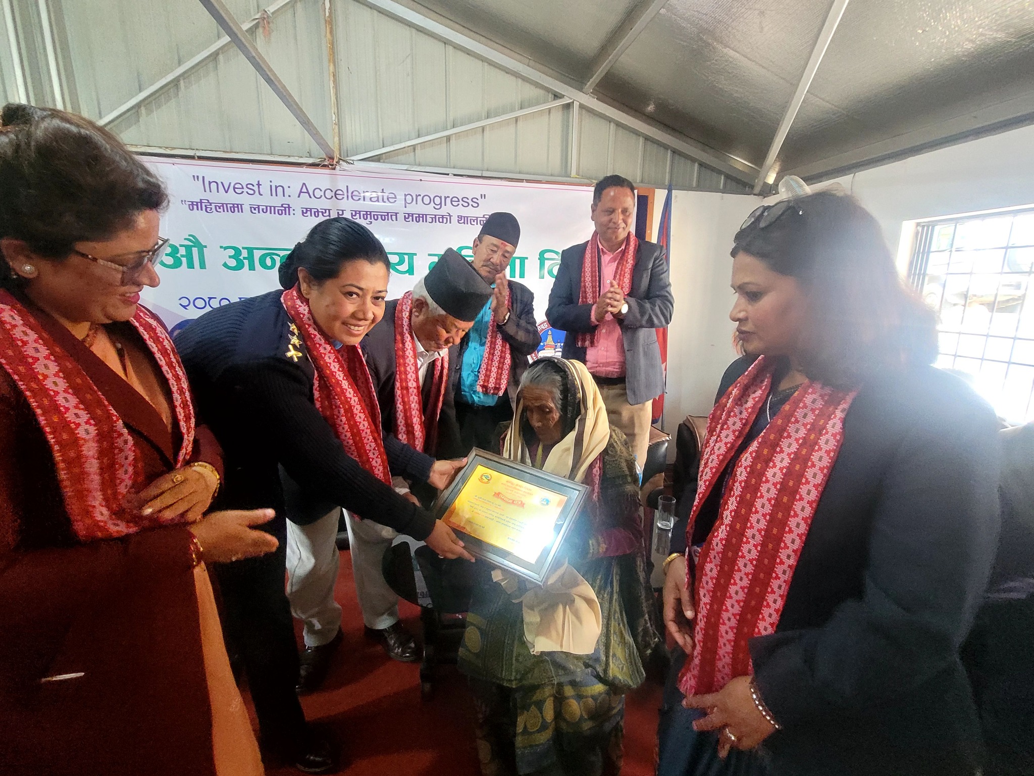 महिला जागरणको क्षेत्रमा भूमिका खेलेबापत मानवअधिकारकर्मी भोजराज तिमल्सिनालाई सम्मान गरिएको थियो । नगर क्षेत्रभित्रै जेष्ठ नागरिक १ सय ३ बर्षीय गेन्द्रप्रसाद कुइकेल र ९९ बर्षीय ठूलीमाया लामालाई नगरपालिकाले सम्मान गरेको छ । नगर प्रमुख कुनसाङ लामा, उपप्रमुख रत्नबहादुर लामा, प्रमुख जिल्ला अधिकारी रुद्रादेवी शर्माले उनीहरुलाई सम्मान गरेका थिए । कार्यक्रममा नगर प्रमुख कुनसाङ लामाले नमोबुद्ध नगरपालिकाले महिला लक्षित विभिन्न योजना र कार्यक्रम सञ्चालन गरिरहेको भन्दै महिलाको नाममा उद्योग दर्ता गर्दा लाग्ने दस्तुर मिनाहा गरेको पनि बताए ।