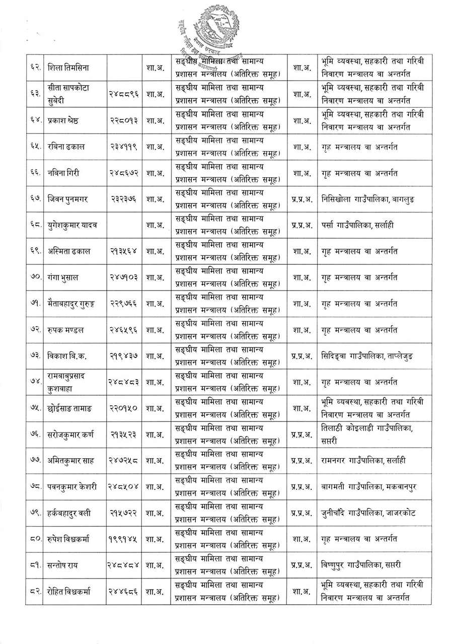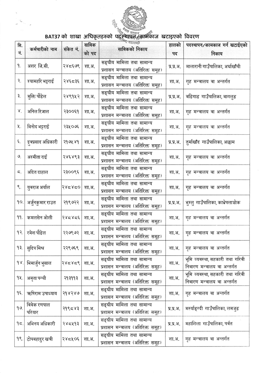 काठमाडौं । सरकारले नयाँ ८२ जना शाखा अधिकृतलाई पदस्थापन गर्दै कामकाज तोक्ने निर्णय गरेको छ । मंगलबार संघीय मामिला तथा सामान्य प्रशासन मन्त्रालयले शाखा अधिकृतहरूलाई पदस्थापन गरेको हो ।
