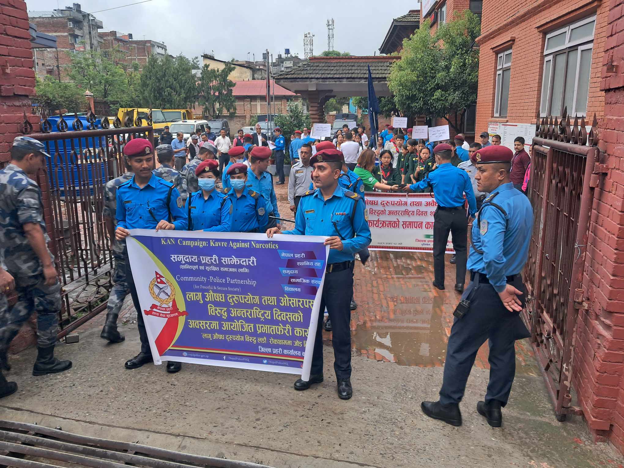 कार्यालयका सुचना अधिकारी एवं डिएसपी राजकुमार श्रेष्ठका अनुसार काभ्रेमा असार ६ गतेबाट मनाईएको अन्तरराष्ट्रिय दिवसको अवसरमा जिल्लामा विभिन्न कार्यक्रम गरिएको छ । सुरुको दिन सामाजिक सञ्जालबाट लागुऔषध विरुद्ध सन्देश मूलक जनचेतना दिने किसिमको सुचना प्रचार गरिएको थियो भने अन्य १३ वटै स्थानीय तहमा मातहतका प्रहरी युनिटले वडादेखि टोलसम्म लागुऔषध दुरुपयोगका लक्षण र अभिभावकको दायित्व सम्बन्धि सचेतना कार्यक्रम सञ्चालन गरिएको उनले जानकारी दिए ।