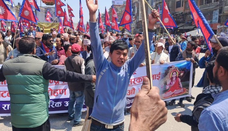 काभ्रे । काभ्रेको बनेपामा आज सोमबार राजवादी समर्थनहरुले प्रर्दशन गरेका छन् । राजसंस्था फर्काउन माग गर्दै बनेपामा राजावादीहरुले प्रर्दशन गरेका थिए । बनेपाको गोदामचोकबाट प्रर्दशन शुरु गरेका राजावादीहरुले बनेपा नगर परिक्रमा पछि चारदोवाटोमा कोणसभा गरेका थिए ।