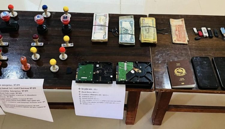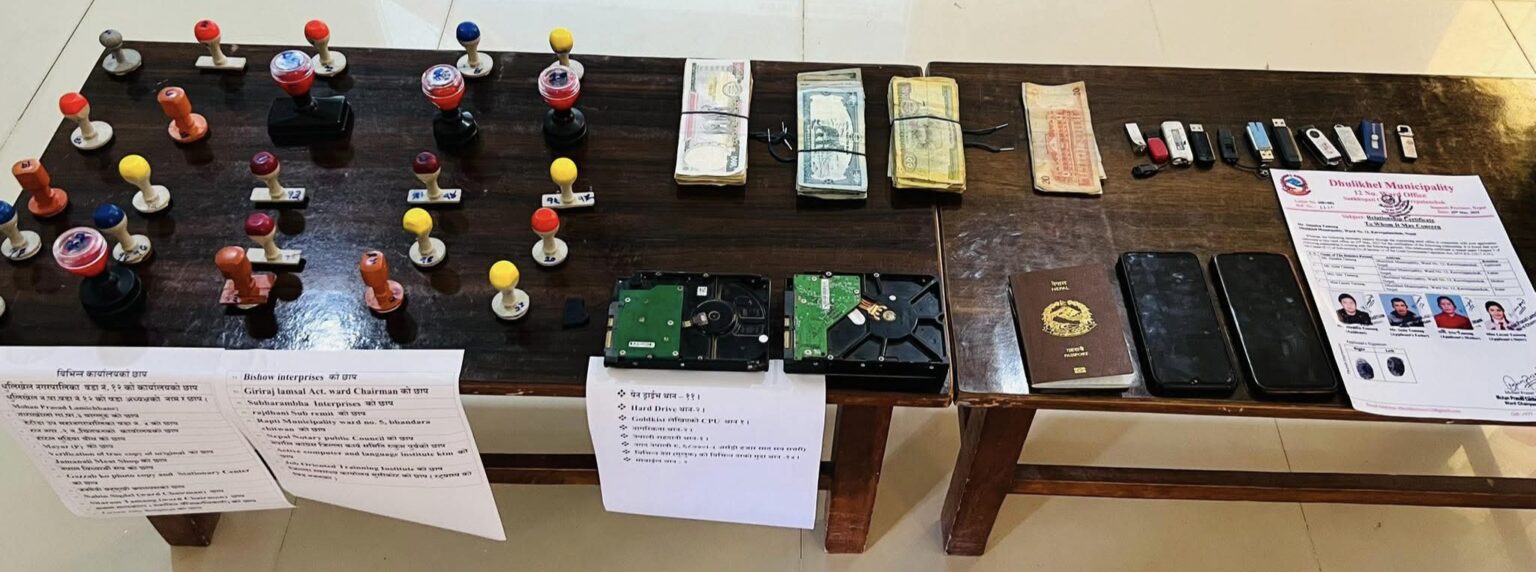 वडा अध्यक्षको हस्ताक्षर नै नक्कली भएको भनी सूचनाको आधारमा प्रहरी टोलीले आवश्यक अनुसन्धान गर्दै जाँदा विभिन्न सघंसंस्थाका २६ स्थान छाप, विभिन्न दरको नेपाली नगद रु ६८ हजार विभिन्न मुलुकको नोट १४ थान नागरिकता दुई थान पासपोर्ट तथा विभिन्न संघसंस्थाको कागजत र पेनड्राइभ ११ थान सिपीयु लगायतका सामग्रीहरु प्रहरीले बरामद गरेको हो ।