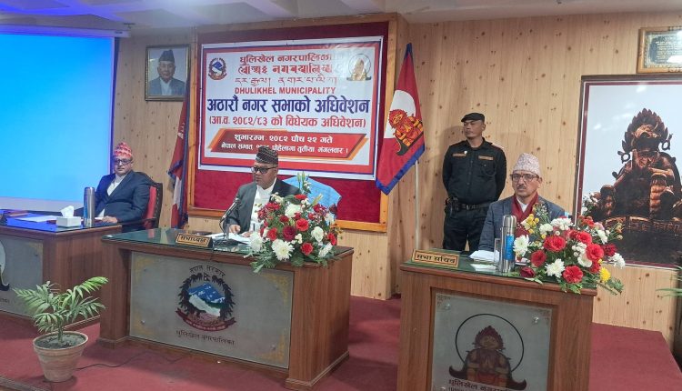 काभ्रे । धुलिखेल नगरपालिकाको १८ औं नगरसभाको अधिवेशन आ.व. २०८२÷८३ को विधेयक अधिवेशन सम्पन्न भएको छ । आज धुलिखेल नगरपालिको हलमा भएको नगरसभाको अधिवेशनले वडागत विभिन्न योजनाका बजेट रकमान्तर प्रस्ताव सर्वसम्मत पारित गदै अधिवेशन सम्पन्न भएको छ । धुलिखेल नगरपालिका नगर सभाको अठारौं अधिवेशनमा गत भ्राद्रमा भएको जेन जी आन्दोलन अन्य प्रभाबले गर्दा राजस्व संकलनमा भएको गिरावट तथा वडा बाट आएको संशोधन बमोजिम संशोधन गरी विभिन्न प्रतिवेदन स्वीकृत समेत गरेको छ ।